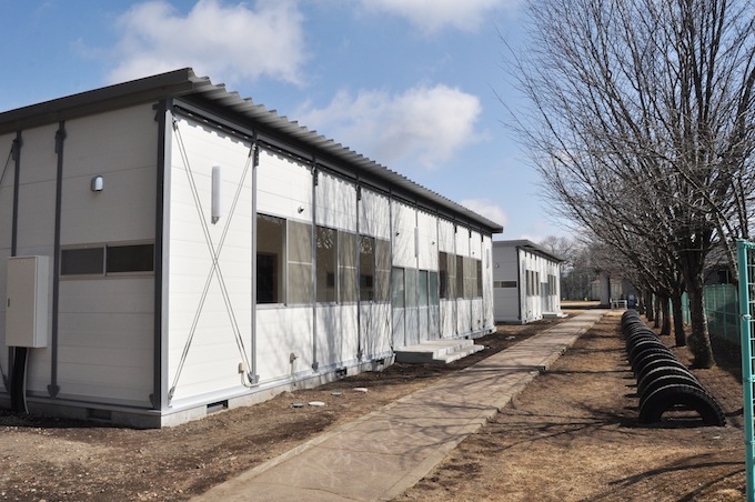 仮設校舎は、校庭の南西に2棟の平屋建て計4教室分を建設。窓は強化ガラスで、空調、水道も教室ごと備えた。毎年4年生と特別支援学級が使っていくことが決まっている。