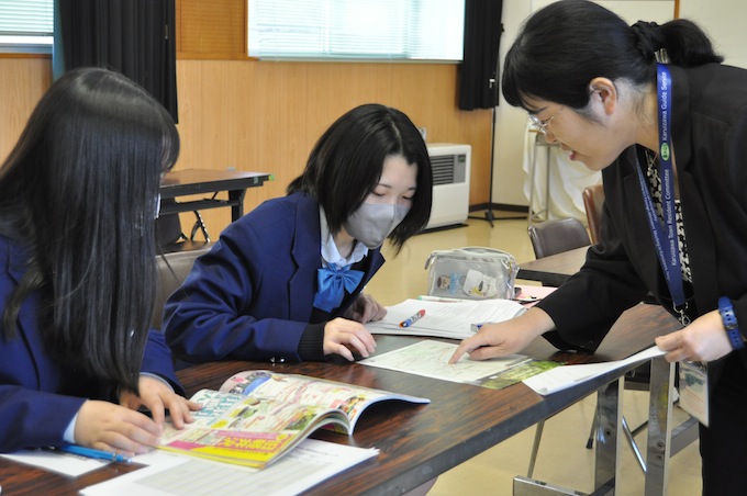 G7長野県軽井沢外務大臣会合(4/16~18)で、軽井沢を訪れる海外のメディア関係者らに、通訳・案内ボランティアを行う高校生が4月13日、直前研修を行った。軽井沢高生4人、佐久長聖高生1人が参加。ボランティアをまとめる町内の通訳案内士永島千絵さんとともに、想定される質問を確認。英語でシャトルバスの乗り場や出発時間を伝えたり、地図を指差しながら飲食店の場所を示す練習をした。
