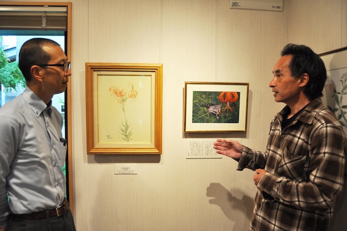 栗岩竜雄さん(右)と石川寛館長(左)。コオニユリの水彩スケッチと、コオニユリの蜜を吸うアゲハの写真の前で。