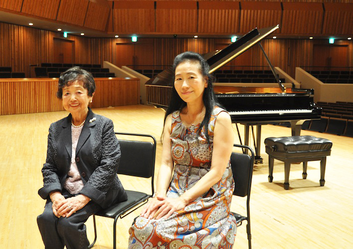 寄贈ピアノをバックに大賀緑さん(左)と、ピアニストの小山実稚恵さん。