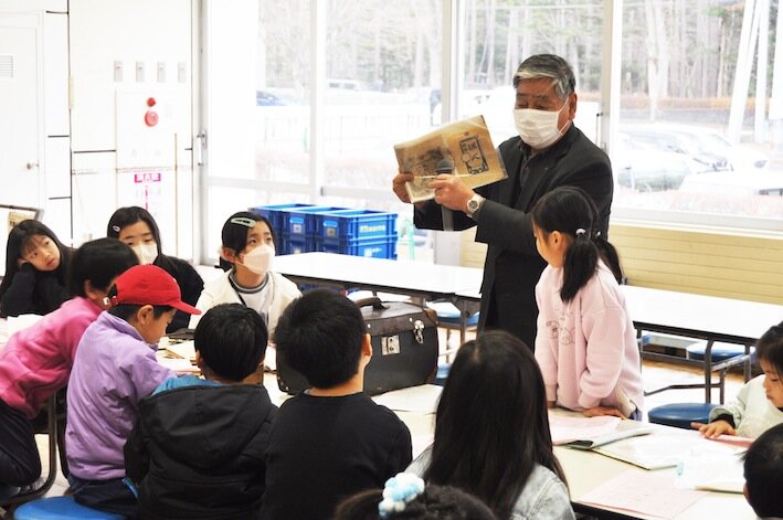 一番人気だった「軽井沢のひみつのへや」では、1890年創業の山屋店主袖山卓也さんが、土産用のせんべい製造に使っていた金型などを持参し使い方を説明。軽井沢と草津を結んだ草軽電気鉄道(1962年廃止)の写真を見せ「よく脱線し、乗客たちが降りて線路に乗せ直すこともあった」などと話し、児童は熱心に聞き耳を立てていた。