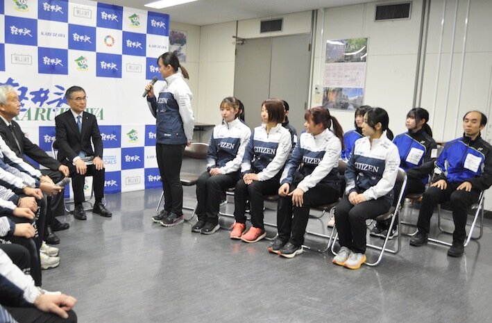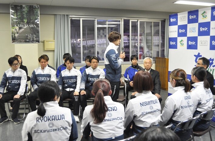 「日本カーリング選手権大会」(1/27~2/4、札幌市どうぎんカーリングスタジアム)に出場する、スポーツコミュニティー軽井沢クラブ所属の4チームが1月9日、軽井沢町役場に土屋三千夫町長を訪ねた。大会には「SC軽井沢クラブ」「SC軽井沢クラブJr.」それぞれの男女チームが出場。各チームのスキップが、大会に向け抱負を語った。
