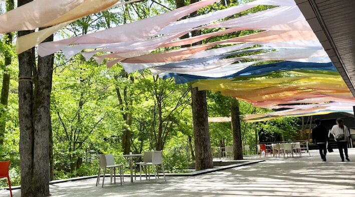 星野エリアの商業施設「ハルニレテラス」で、110色の布が頭上を彩る「Organic Wind」が5月20日から始まった。1914年の「星野温泉旅館」創業から110年を記念したイベントの一環。昨年までは、同時期にカラフルなビニール傘を上空に浮かべていたが、「環境との共生」にも配慮し趣向を変えた。