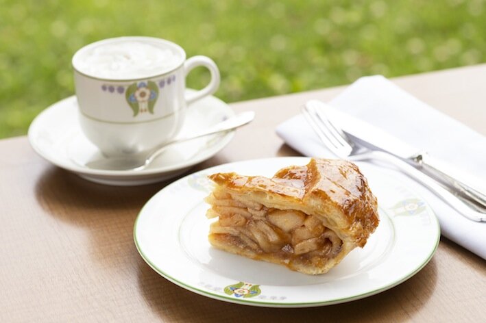 カフェテラスは全102席(テラス52、屋内50)で、9時半~18時に営業。伝統のアップルパイ(1,100円)やロイヤルミルクティー(1,300円)、信州野菜を使ったニース風サラダ(2,500円)などが味わえる。