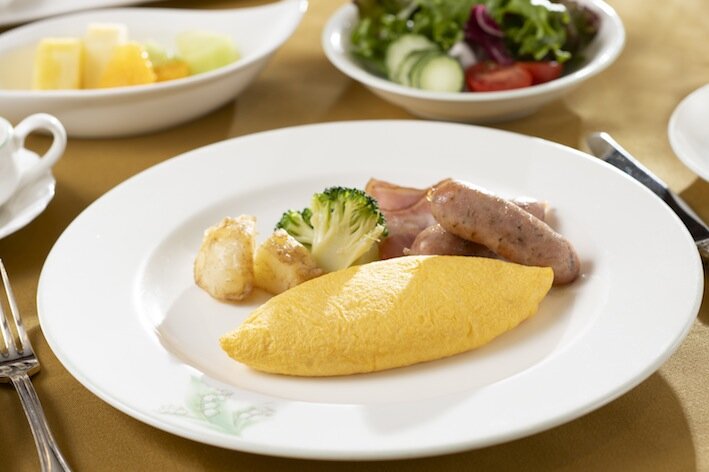 朝食はホテル伝統のオムレツやホテルメイドのトーストを提供
