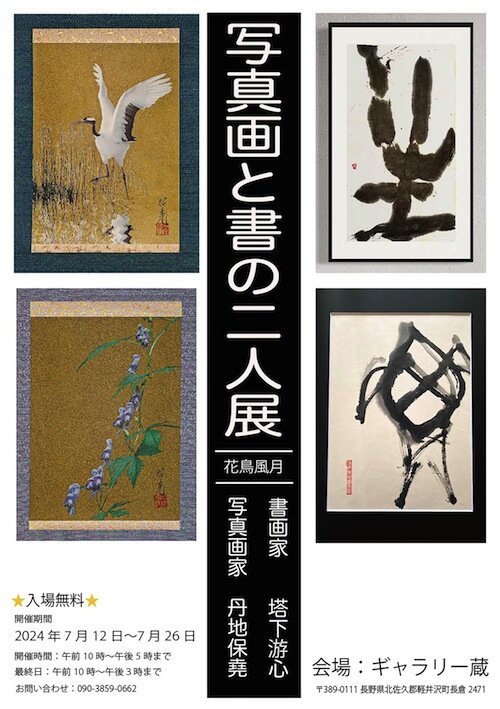 ともに軽井沢在住で写真家の丹地保堯さんと、書家の游心さんによる「写真画と書の二人展」が7月12日から26日まで、離山公園内ギャラリー蔵で開催される。「自然の美しさ」をテーマにした作品を30点ずつ展示。丹地さんの絵画を思わせる幻想的な「写真画」と、游心さんの一文字で表した力強い「書」が並ぶ。丹地さんは「軽井沢の自然に触れて精神的に癒されるように、書や写真を見てリラックスしてもらいたい」。期間中は、持参した写真データを丹地さんが寸評してくれる公開レッスン(14日14~16時)や、游心さんの書道教室公開レッスン(17日10~12時)、うちわなどに墨で絵を描く墨画体験(24日13~14時半)などのワークショップも行う。朗読と書のライブ(13・20日15時~)、ドイツ生まれの竪琴ライアーの演奏(20日13時~)も。いずれも事前申し込みは不要。