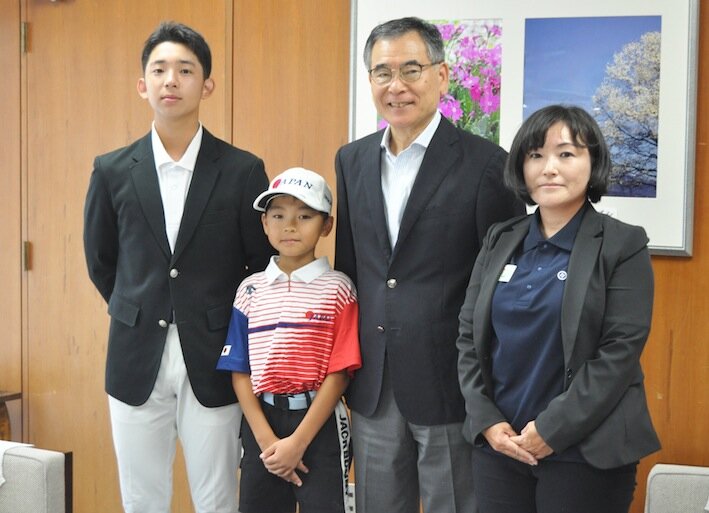 軽井沢インドアゴルスクールに通う軽井沢西部小4年の松橋昌佑さんと、軽井沢中学3年の依田悠誠さんが8月6日、町長を表敬訪問し、出場を決めた次の上位大会に向け意気込みを語った。