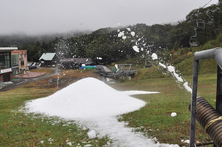 軽井沢プリンスホテルスキー場は10月4日、県内スキー場で最も早い11月1日のオープンに向け造雪を開始した。7日まで2基、8日からは8基の造雪機を24時間稼働させ、オープンまでの28日間で6,000㎥の雪をつくる。10月も高温になることを想定し、例年より3日雪造開始を早めた。