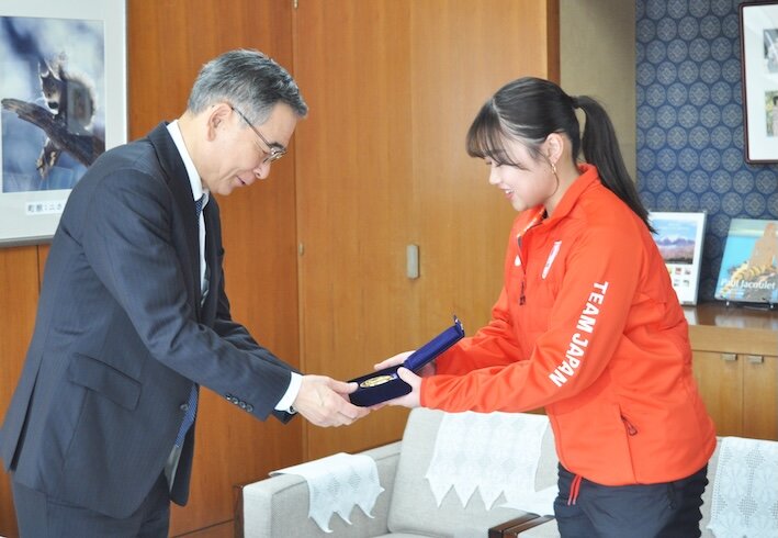 学生による国際競技大会「冬季ワールドユニバーシティーゲームズ」(イタリア・トリノ、1/13~23)のカーリング女子で優勝した日本代表メンバーで、軽井沢町の荻原詠理さん(立教大4年)が2月17日、町役場を訪ね優勝を報告した。同競技での日本の表彰台は2007年女子の銅メダル以来で、金メダルは男女通じて初めて。