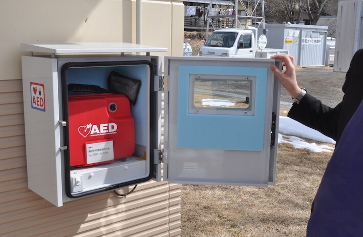 AEDは、全身に血液を送るポンプ機能を失った心臓に、電気ショックを与え、正常なリズムに戻すための医療機器。ボックスから取り出したら、開いて電源を入れ、流れる音声ガイドに沿って使用できる。町は使い方などを学ぶ救命講習会を、公民館ごとに順次開く予定だ。