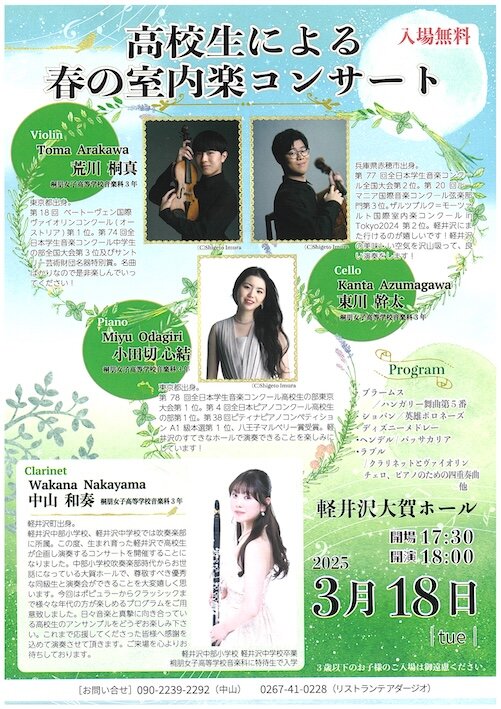 軽井沢町出身で桐朋女子高校音楽科3年の中山和奏さんら、同校の同級生4人による室内楽コンサートが3月18日、軽井沢大賀ホールで開催される。クラリネットの中山さんのほか、ヴァイオリン、ピアノ、チェロの編成。ポピュラーからクラシックまで、様々な年代が楽しめる曲を演奏する。