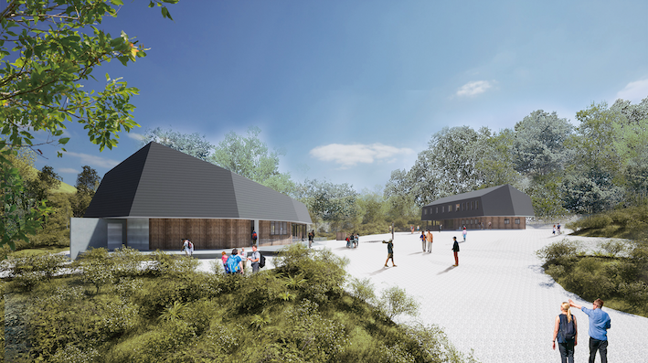 尾瀬の玄関口 鳩待峠に佇む「LUCY 尾瀬鳩待」(右)と「はとまちベースCafe & Shop」(左)の完成イメージ。