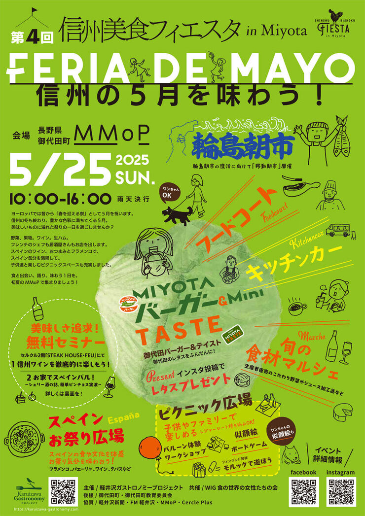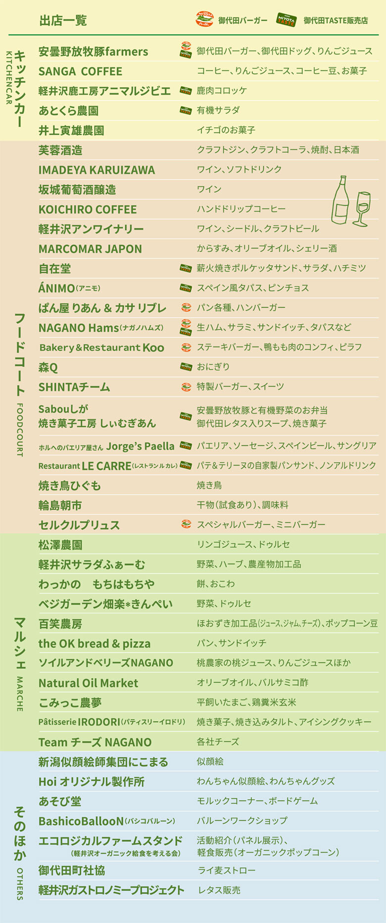 御代田のレタスを使った「御代田バーガー」を始め、弁当や惣菜などを販売するフードコートやキッチンカーに、農産物や菓子などを扱うマルシェなど40店以上が出店を予定。石川県輪島市から「移動朝市」が出店し、干物や調味料を販売する。信州ワインやスペインバルの魅力を語る無料セミナーも開催。10〜16時で雨天決行。