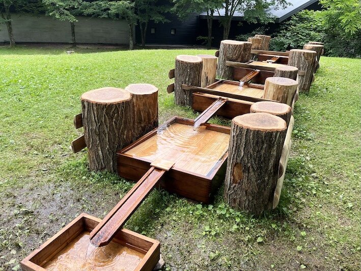 立ち寄り湯「星野温泉トンボの湯」は7月1日〜9月7日、夏でも冷たい野鳥の森の湧水を利用した「トンボの足水浴」を施設隣りのカラマツの丘で開く。夏の涼を感じてもらおうと初めて企画。タテ90cm×ヨコ110cm×高さ20㎝の水桶を斜面に4つ設置。最大で12人が同時に足を浸けられる。