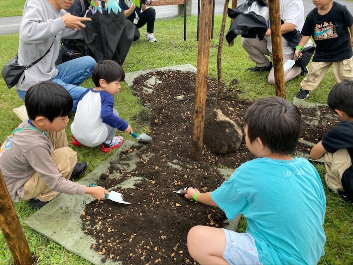 「長く愛される施設に」と想いを込め「長命」の花言葉があるバラ科の「ハナモモ」を、施設内の芝生のひろばに植樹。子どもらは「大きくなあれ」と声をかけながら、木の周りにスコップで土をかけた。