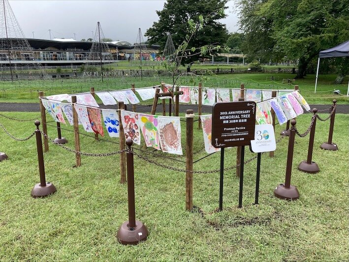 ハナモモは全長3mまで育ち、春には赤や桃、白色の花を咲かせるという。この日は、ペイント体験もあり、園児らは花が咲いたときの姿を想像しながら絵を描き、植樹したハナモモの周りに展示。作品は9月末日まで設置を予定している。