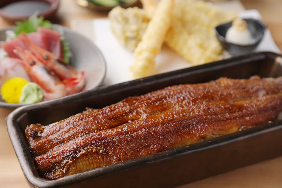 うなぎ四代目菊川は昭和7年創業の老舗卸問屋直営。まずこちらで味わいたいのは、名物の「蒲焼き一本重」。訪れた多くのお客様が注文する看板メニューの一つです。うなぎが丸ごと一本を贅沢に乗せた一品で、見た目のインパクトはもちろん、老舗ならではの技で焼き上げる香ばしいうなぎと、創業以来守り続けてきた「秘伝のたれ」が絶妙に絡み合う至福の味わいです。名物「一本うなぎ」の器は、江戸時代から続く窯元に依頼した特注品。