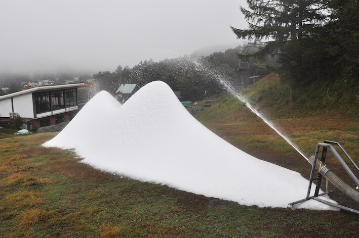 長野県内のスキー場では最も早い11月1日のオープンに向け、軽井沢プリンスホテルスキー場が10月4日から造雪を始めた。全国的に残暑が長引くとの予報から、昨年同様に数日早めて雪づくりに着手した。7日まで2基、8日からは全8基の造雪機を24時間稼働させ、1日約450トン、オープンまでに約6000㎥の雪を造る。