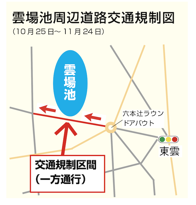 紅葉シーズンに雲場池を訪れる人の安全確保、混雑対策のため10月25日から11月24日まで、同池南側の道路で車両(自転車を除く)の一方通行規制が行われる。8時から17時まで、六本辻ラウンドアバウト側からのみ進入可能に。期間中は警備員を配置し、交通標識も設置する。