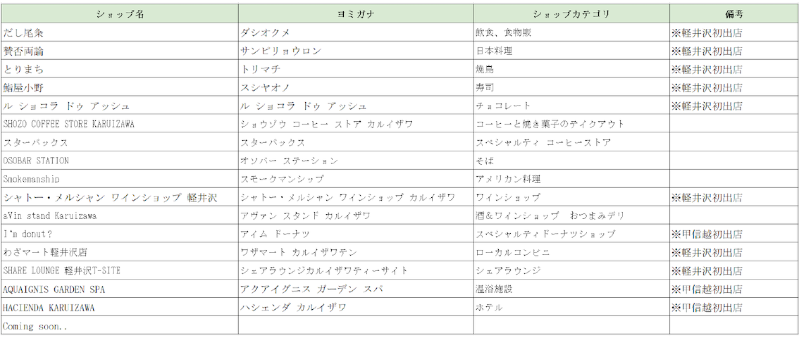 飲食・物販では、無添加だし専門店「だし尾粂」、ショコラトリー「ルショコラドゥアッシュ」、東御市発のローカルコンビニ「わざマート」などが出店。町内の商業施設「軽井沢コモングラウンズ」でも営業するそば店「OSOBAR STATION」、コーヒー店「SHOZO COFFEE STORE KARUIZAWA」も入る。