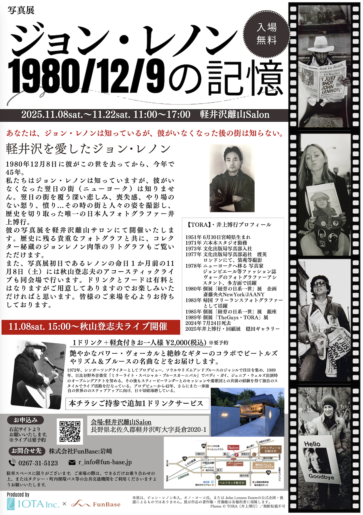 ジョンの訃報を伝える新聞を手にする若者、街を覆う深い悲しみや怒り...。歴史に残る貴重な写真約50点のほか、ジョンの肉筆が入ったリトグラフも展示する。「この世に『愛と平和』を提唱し、「軽井沢」を愛した彼の"記憶"を辿る内容です」と主催者。入場無料。時間は11:00~17:00。
