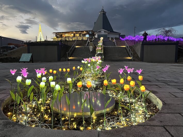 小諸市の飯綱山公園にある複合施設に、シャンパンゴールドの星々をイメージしたイルミネーションが登場。ワイン棟とレストラン棟を結ぶ階段中央には、チューリップや百合などの花をモチーフにした電飾が煌めく。