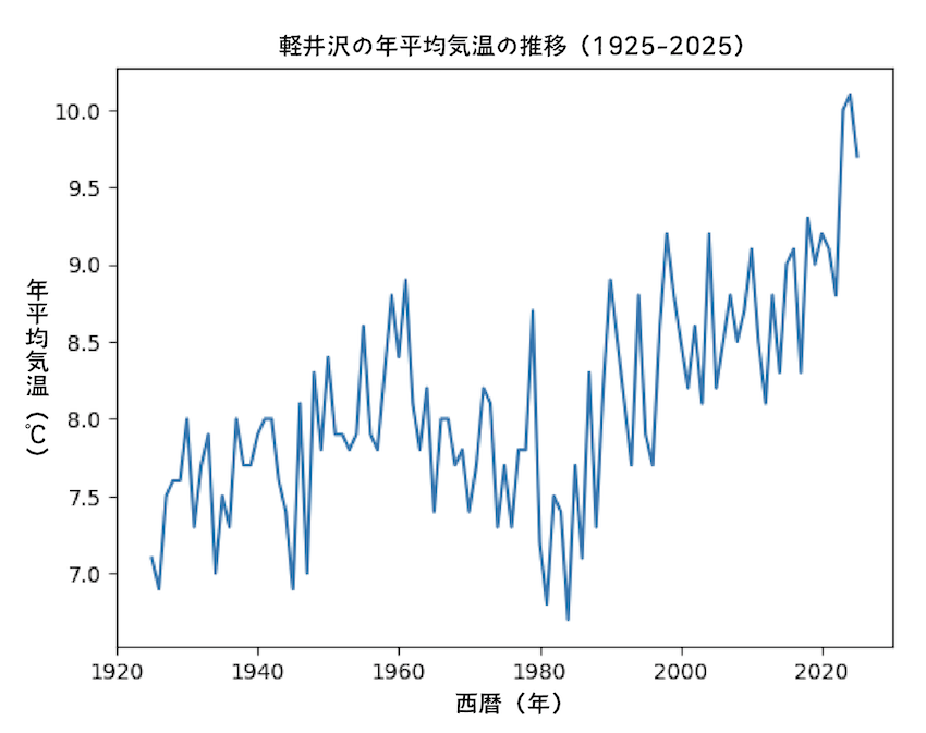 2025年の軽井沢の平均気温は9.7度で、1925年の統計開始以降、3番目に高かったことが、気象庁の公表データで分かった。最高は2024年の10.1度、次いで2023年の10.0度で、直近3年間が過去100年の上位3位を占めた。
