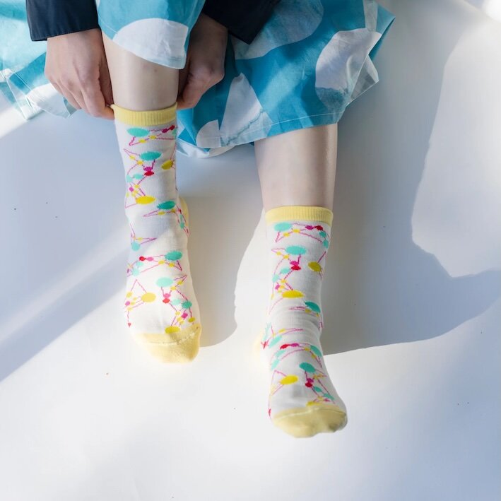 写真=原画をパターン化して編み上げたクルーソックス。※展示販売品