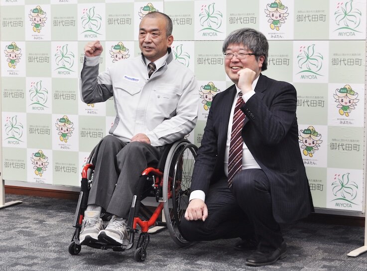 写真=ガッツボーズする、車いすカーリングの中島選手(左)と小園町長。