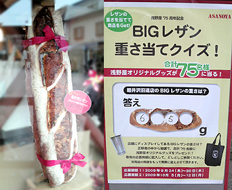 浅野屋で、創業75周年を記念して、「BIGレザン重さ当てクイズ」を実施している。