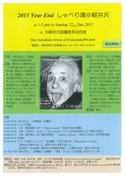 12月22日(日)、中軽井沢図書館多目的室で「2013 Year End しゃべり場@軽井沢」が開かれる。主催者は佐藤建吉千葉大学工学部准教授で、イベントの目的は軽井沢の文化や自然について話し合い、地域活性化へつなげること。「アートは地域活性化とどう関われるか」、「軽井沢に期待すること、軽井沢から発信すること」などをテーマに、司会者、パネリスト、参加者が語り合う。