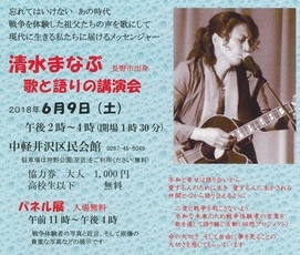戦争を風化させてはいけないと、6月9日に「清水まなぶ 歌と語りの講演会」が中軽井沢区民会館で行われ