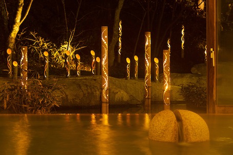 星野温泉トンボの湯は3月20日まで、内湯と露天に70本の竹細工のランタンを設置する。穏やかな光がこ