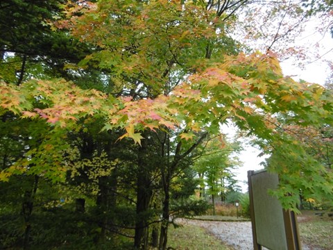 中軽井沢・町役場前の公園 いつも静かな隣の公園。長雨で寒い日が続いていましたが、今日は曇り。モミジが