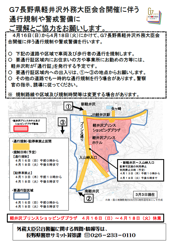 軽井沢町で開くG7外相会合にともなう通行規制は4月16日0時から18日17時まで。プリンス通り(新