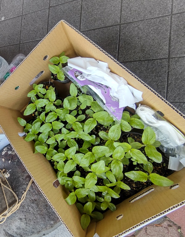 追分公民館の入り口で配布されているヒマワリやカボチャの苗。誰でも持っていけるように、苗を入れた段ボ