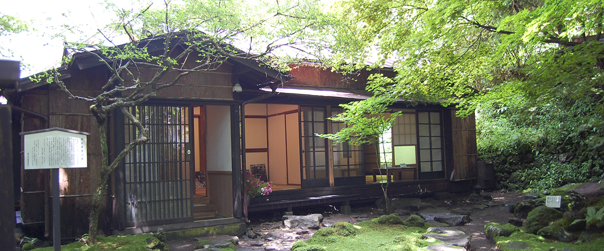 室生犀星は石川県金沢市生まれの詩人、小説家。知人には堀辰雄、立原道造、志賀直哉、川端康成がおり、ここで度々交流することもあったそうです。 昭和6年に建設され、室生犀星は亡くなる昭和36年の夏まで、ここで過ごしていました。 彼は苔をこよなく愛し、その庭園に広がる苔は一見の価値ある美しさです。 夏になるとこの場で執筆活動に取り組んでいました。この場所へ向かう途中の細い道も、歴史を感じる苔生した石垣や立ち並ぶ涼しげな木々などを眺めることができ、その風情と趣を楽しむことが出来ます。