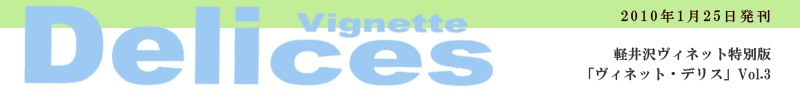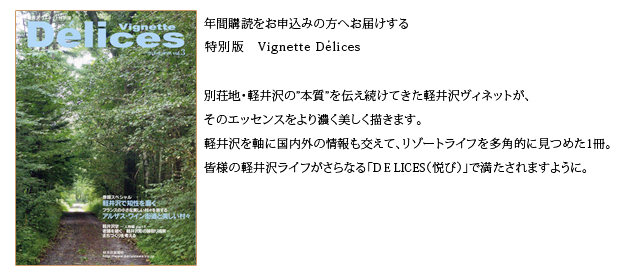 ●「ヴィネット・デリス」は、「軽井沢ヴィネット」年間購読をご利用の方に、 年一回プレゼントさせていただいておりした。 ヴィネット・デリスVol.5以降は一般販売とさせて頂きます。 お得な定期購読をお薦めいたします。 →軽井沢ヴィネット年間購読についてはこちら お問い合わせは軽井沢新聞社(TEL:0267-46-3001/メールはこちら)までお願い致します。