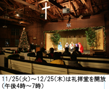 11/25(火)〜12/25(木)のウィークデイ、午後4時〜7時には美しく飾られた礼拝堂を開放。手作りのクリスマスクッキーとホットアップルサイダーで訪れた人を迎えてくれる。