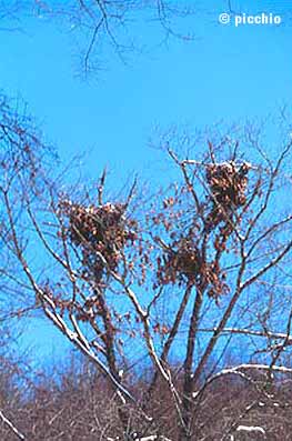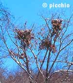 木の高いところに小枝の塊がありませんか?もしもバレーボール大のまぁるい形で薄い木の皮が絡めてあるようだったら、それはリス(ニホンリス)の巣。形が崩れておらずしっかりしていれば、今使っている巣でしょう。昼間活動するリスたちも、冬の日の午後は、体力の消耗をおさえてこの巣の中で眠って過ごしています。