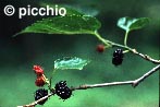さて、こんなおいしい実を森の生き物たちが放っておくはずがありません。夏のおいしいデザートをいただこうと、いろいろな生き物がヤマグワにやってきます。ヒヨドリは甘い果実が大好物。桑の実も例外ではありません。種ごと飲み込まれ、消化されない種は糞とともに森のあちこちにばらまかれることになります。他の小鳥たちもやって来ますが、お目当ては実よりも実を食べに集まってきた虫のようです。この時期の桑の実にはアリやカメムシなど小さな昆虫がたくさんつきます。