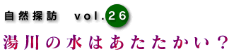 そんな湯川は、名前の通りお湯が流れているかというと、そうではありません。名前は、冬に外気温との温度差で川面 から湯気がたちこめることからつきました。しかし、湯川の本流は町を流れる他の川より水温が1〜2℃高いことがわかっています。これは、川底のところどころから常に20℃位の温かい水が湧き出ているからなのです。