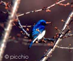 鳴いている姿を観察していると、枝から飛び出しては戻り、また飛び出しては戻るという行動をしています。実はこの行動、木々のまわりを飛ぶ虫を捕まえているのです。オオルリの英名は、Blue-and-white Flycatherといいます。名は体を表すといいますが、全くその通りですね。 |