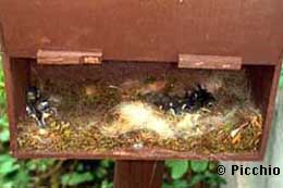 ![]() ポスト(巣)の中のヒナたち ![]() エサをくわえたシジュウカラ |