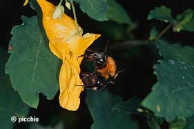 ハチは、甘い蜜を集めに花へとやってきます。キツリフネの花は、その蜜を花のお尻にある細長い管にためています。その蜜を取ろうと一生懸命花の中に潜り込み、その時背中に花粉が付くという仕組みになっているのです。マルハナバチは、蜜を集め始めると同じ種類の花の蜜ばかりを集める習性があります。そのため花粉は無事に他のキツリフネの花へ運ばれ、受粉されるのです。物言わずに咲いている花たちですが、自分の子孫の残すために様々な工夫をしているのです。