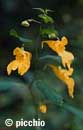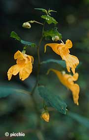 また沢沿いの明るい所では、黄色い花が道を彩るように沢山咲いています。この花、名前をキツリフネと言います。森のいたるところで見られるので、ついつい前を通りすぎてしまいがちですが、ちょっと足を止めて観察してみましょう。よく花の形を見ると舟をひっくり返したような変わった形をしています。そして花のお尻には細長い管のようなものも付いています。キツリフネの花は、なぜこの様な形になったのでしょう。実はこの花、昆虫のマルハナバチと契約を結び、ハチに蜜を与えるかわりに花粉を運んでもらっているのです。花の前でじっと待っていますと、体の丸いマルハナバチがやってきてもぞもぞと花の中に入っていく姿が観察できるかもしれません。