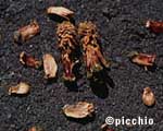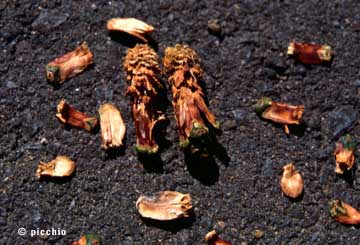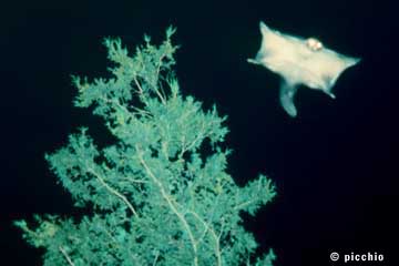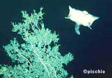 星野温泉の周辺にはアカマツの木があり、今年もたくさんの松ぼっくりをつけています。そんなアカマツの木の下へ行ってみると、何者かにまわりをはがされ、種を食べられた松ぼっくりが落ちています。拾ってみると、まるでエビフライのような形になっています。ちょっと知っている人は、「あー、ニホンリスが食べたあとだ」と思うことでしょう。しかし、同じ様にして松ぼっくりを食べる動物が他にもいることは、あまり知られていません。![]() 鱗片をはがされて種を食べられた松ぼっくり その動物、名前をムササビと言います。皆さんもよく知っているリスは、昼間動き回っています。ところが同じリスの仲間でもムササビは、昼ではなく夜に活動します。日没後30分ぐらいすると、休んでいた巣穴から起き出し、夜の闇へ飛び出すのです。 |