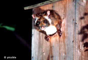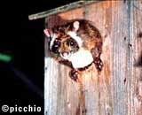 ![]() 巣穴から顔を出すムササビ ムササビは、植物の実や葉などを食べながら明け方まで活動し、また巣穴へ戻ってきます。そして今の時期は松ぼっくりも食事のメニューに入っているのです。 国道146号線をはさんで、野鳥の森の向かい側にあるホテルブレストンコートの駐車場には沢山のアカマツの木があり、よなよなムササビが木から木へと滑空をしています。普段なかなか見ることのない夜の動物“ムササビ”を観察してみませんか