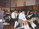 ![]() 第1次審査の会場風景。気に入った曲があると、審査員はうちわを掲げ、壇上でピッキオの係員が数を数えるという審査方法。曲を聴き、歌詞のわかりやすさ、印象に残る曲か、歌いたい曲かで判断される。 ![]() 審査員は10代〜60代まで、自薦他薦約100名が参加。軽井沢中学や軽井沢高校の生徒 も参加した。 |