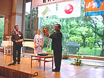 国際親善交歓会開催 カナダ・ウィスラーより記念品贈られる 8月9日、『町制80周年記念・国際親善交歓会』が、軽井沢プリンスホテルで開催された。3時から町制80周年の記念式典が行われ、町獣・町鳥の制定を行った記念事業などが報告された。4時から『国際親善交歓会』が行われ、式典出席者、別荘関係者ら約850人が参加。姉妹都市カナダ、ウィスラーの市長オーレリー夫妻や、音楽ホールの寄贈で話題の大賀典雄さんの姿も見えた。オーレリー市長は「ウィスラーでのオリンピック開催が決まったことを報告できるのは嬉しいことです。軽井沢の経験から多くのことを学び、共に姉妹都市関係を構築していきたい」と述べ、軽井沢町長へ記念品が手渡された。記念品はカナダの先住民族に伝えられる『ズェズェ』と呼ばれる木製のマスクで、水と緑を守る湖の精霊を表した物。佐藤町長は「このマスクを大事にしながら水と緑を大切にしていきたい。」と語った。 |